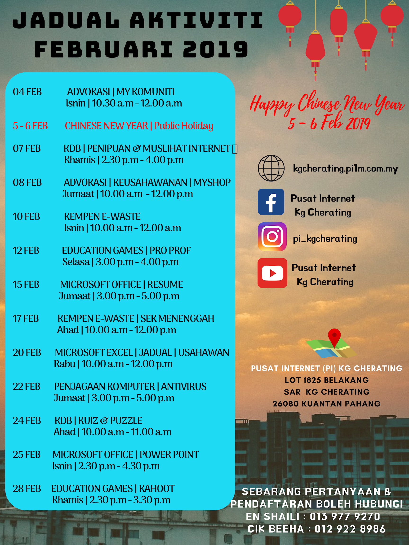 PROGRAM Microsoft Word | Kelas Membuat Jadual Kelas TARIKH 18 Januari 2019 MASA 3.30 – 4.30 Petang LOKASI PUSAT INTERNET KG CHERATING PESERTA 1 Orang Tujuan Memberi pendedahan kepada pelajar untuk mempelajari program Microsoft Word […]